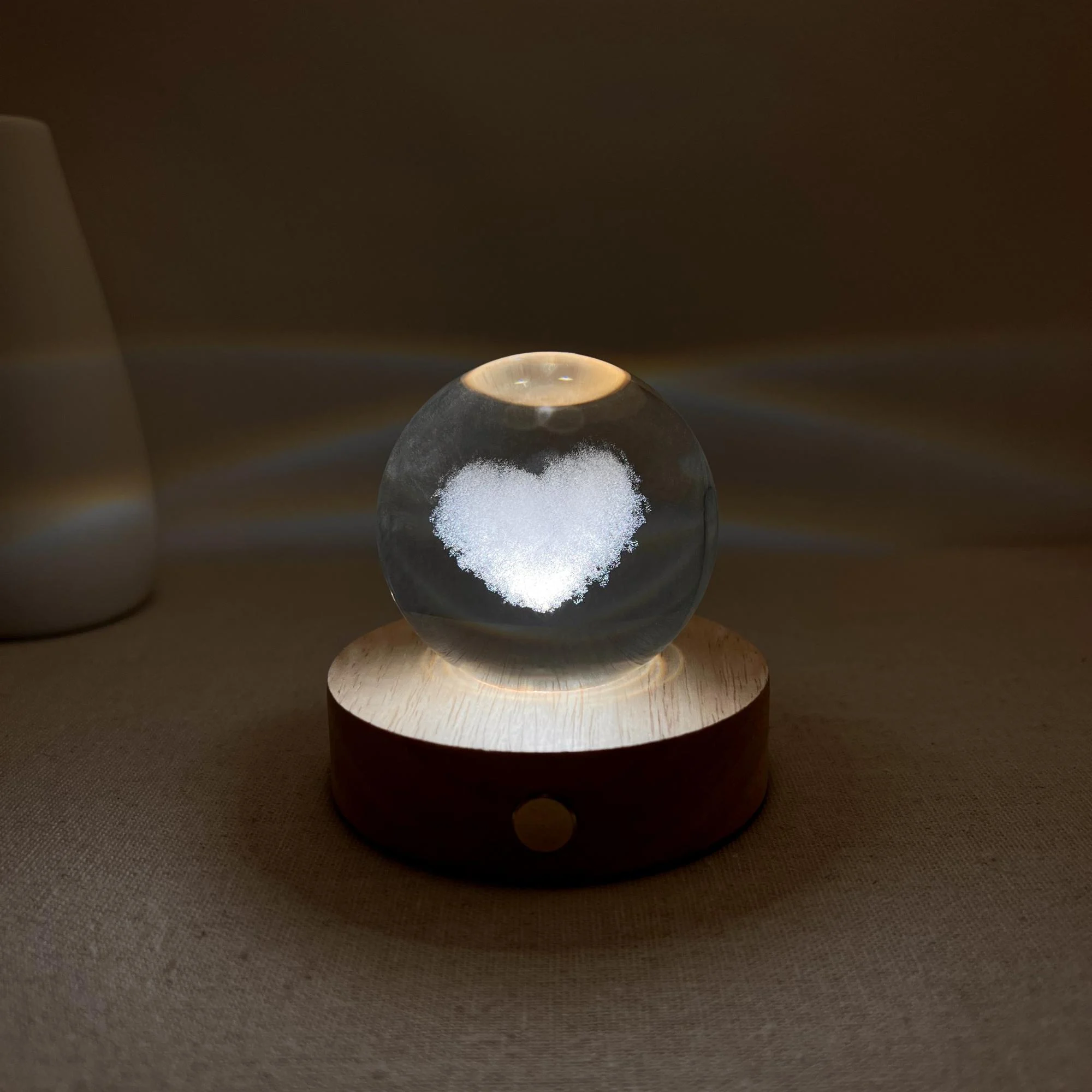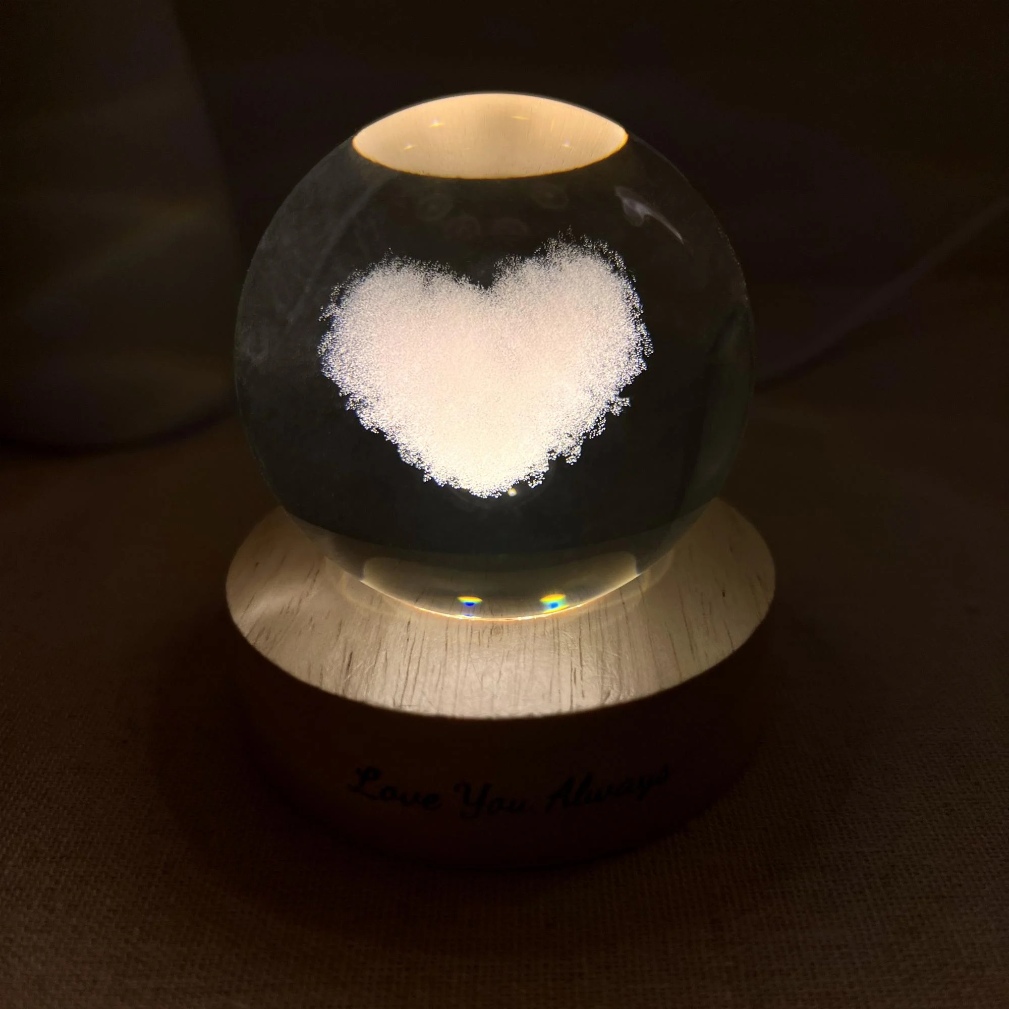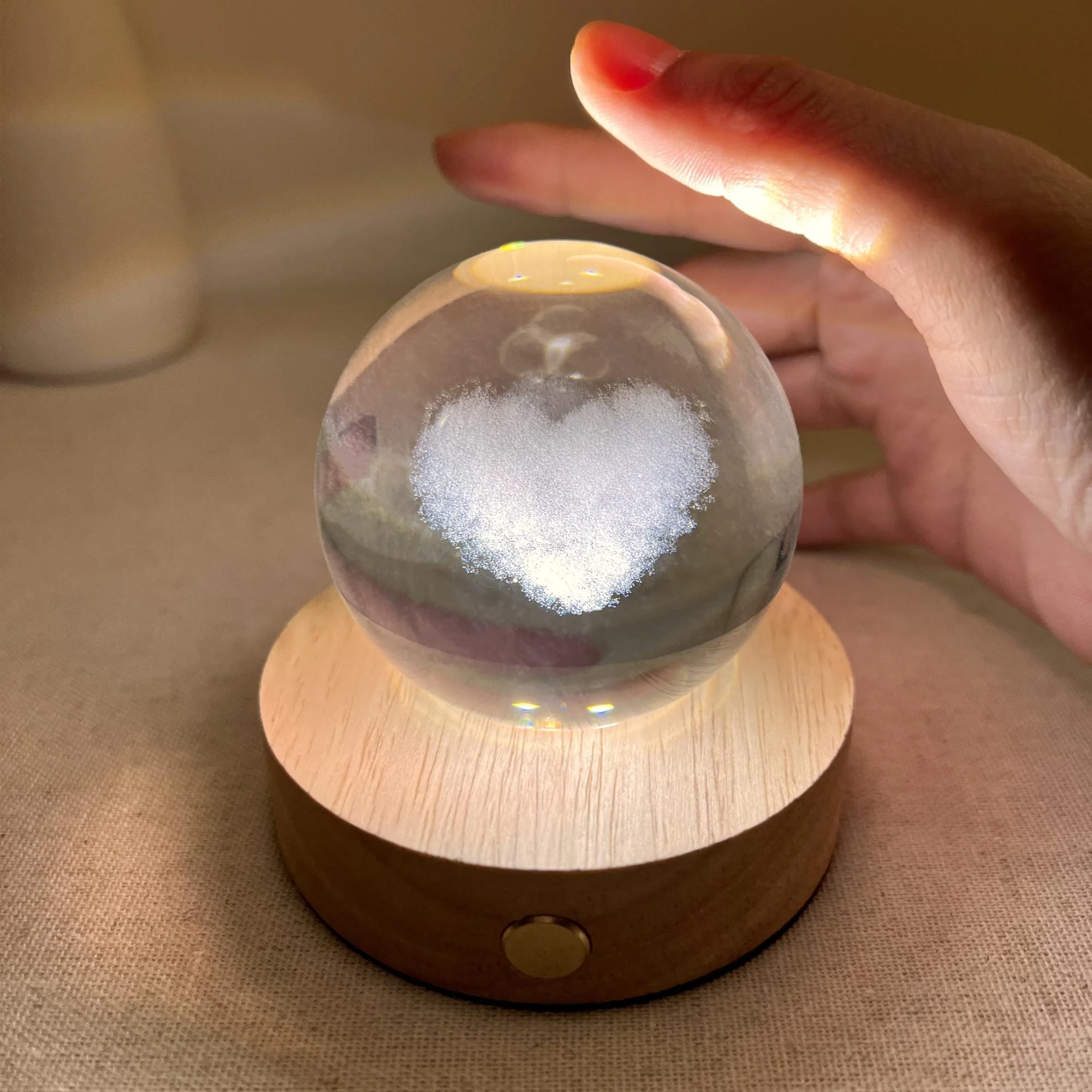 In a transparent crystal ball, a white cloud heart floats, meticulously carved. When the warm light from the wooden base is turned on, the heart emits a gentle glow, spreading throughout the space. This special light also creates sparkling rings on the ceiling, like a miniature galaxy, bringing a romantic and peaceful feeling.
