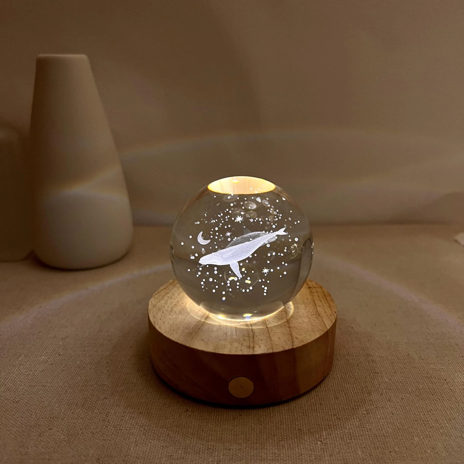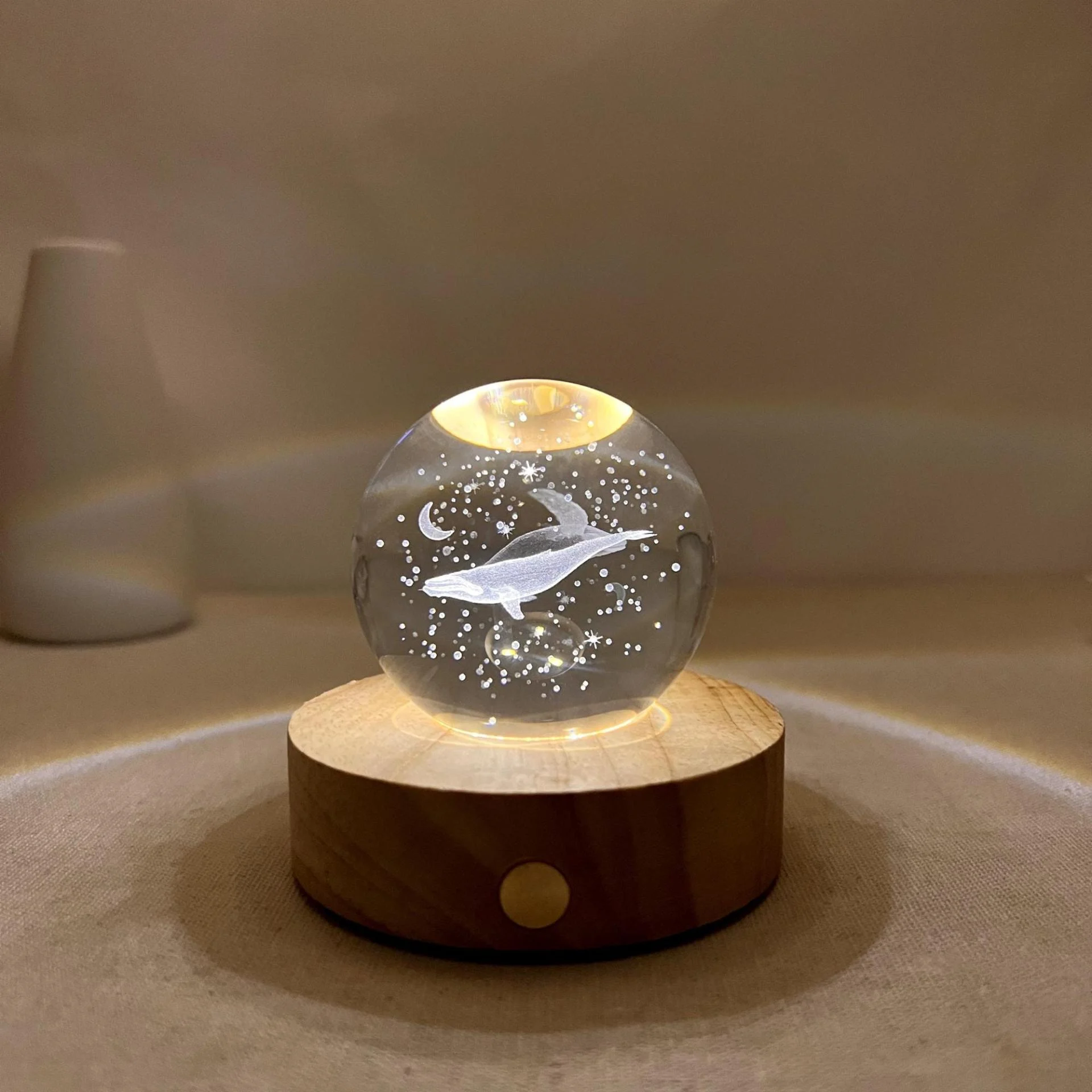 Magical Light Effect: The wooden base is equipped with six small LED lights that shine through the crystal globe, creating a unique lighting effect. This light not only highlights the whale carving but also projects luminous circles onto the ceiling, resembling a miniature galaxy.