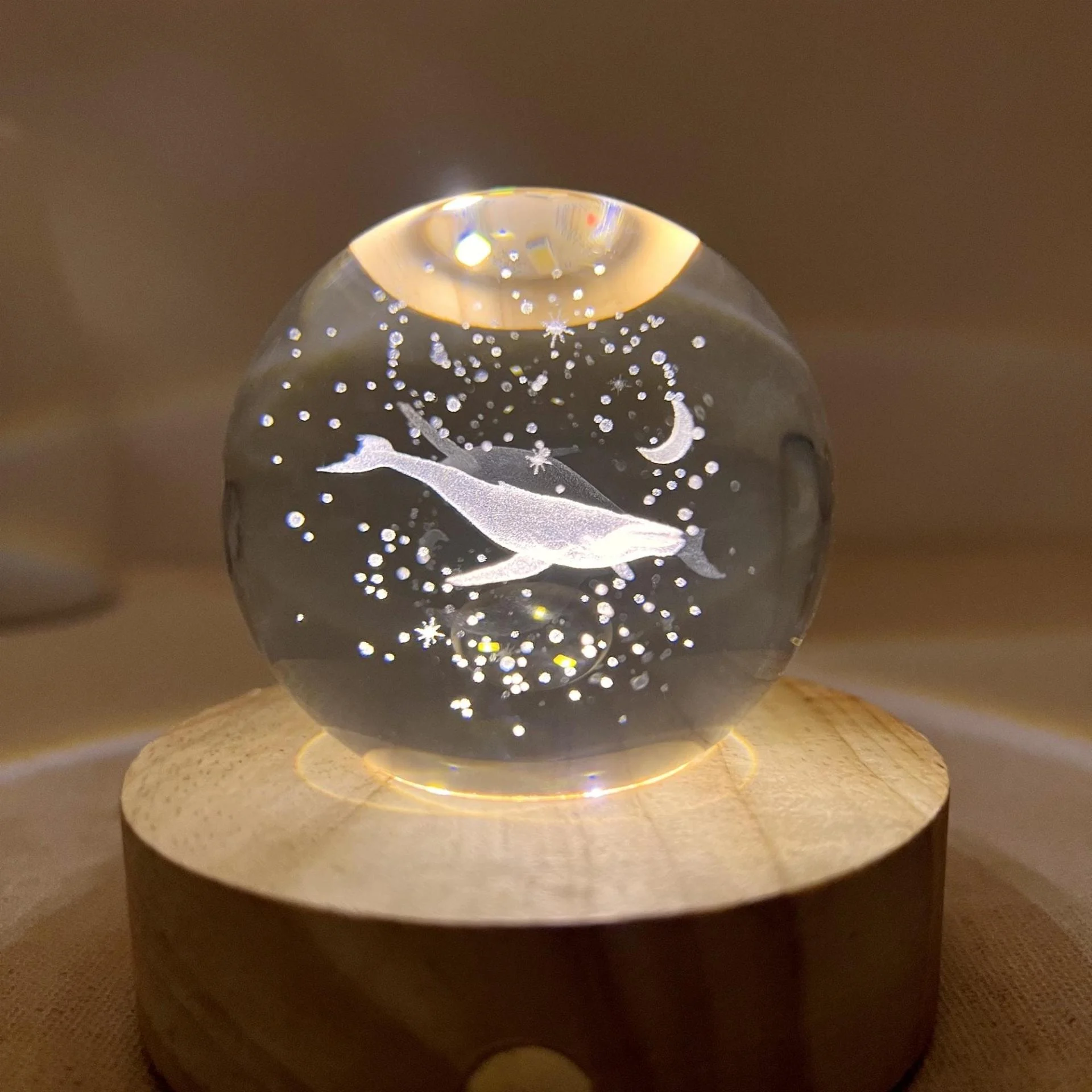 Unique Design: The transparent crystal globe features a lifelike 3D carving of a whale soaring through a starry sky with a crescent moon. The meticulously carved details create an impressive sense of depth.