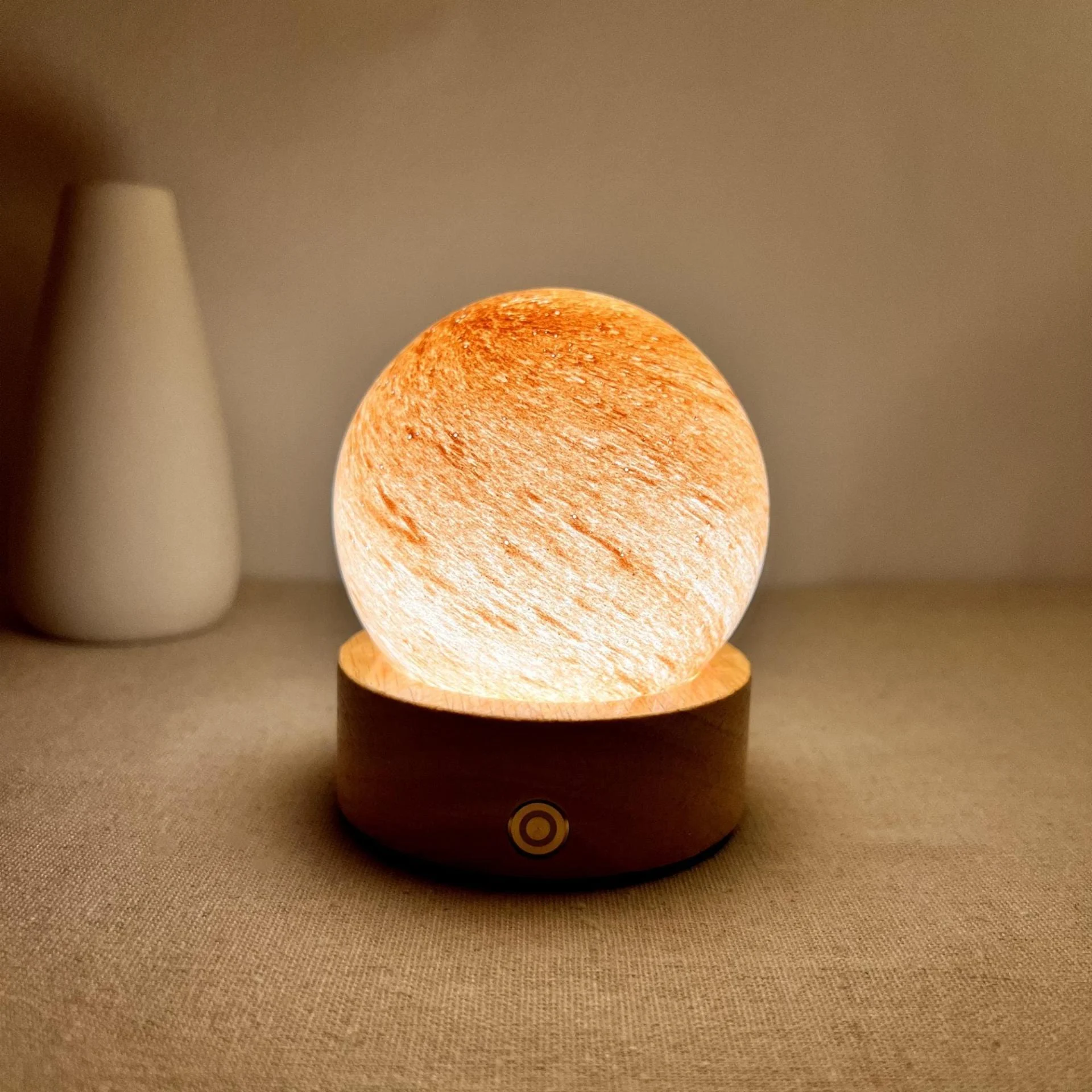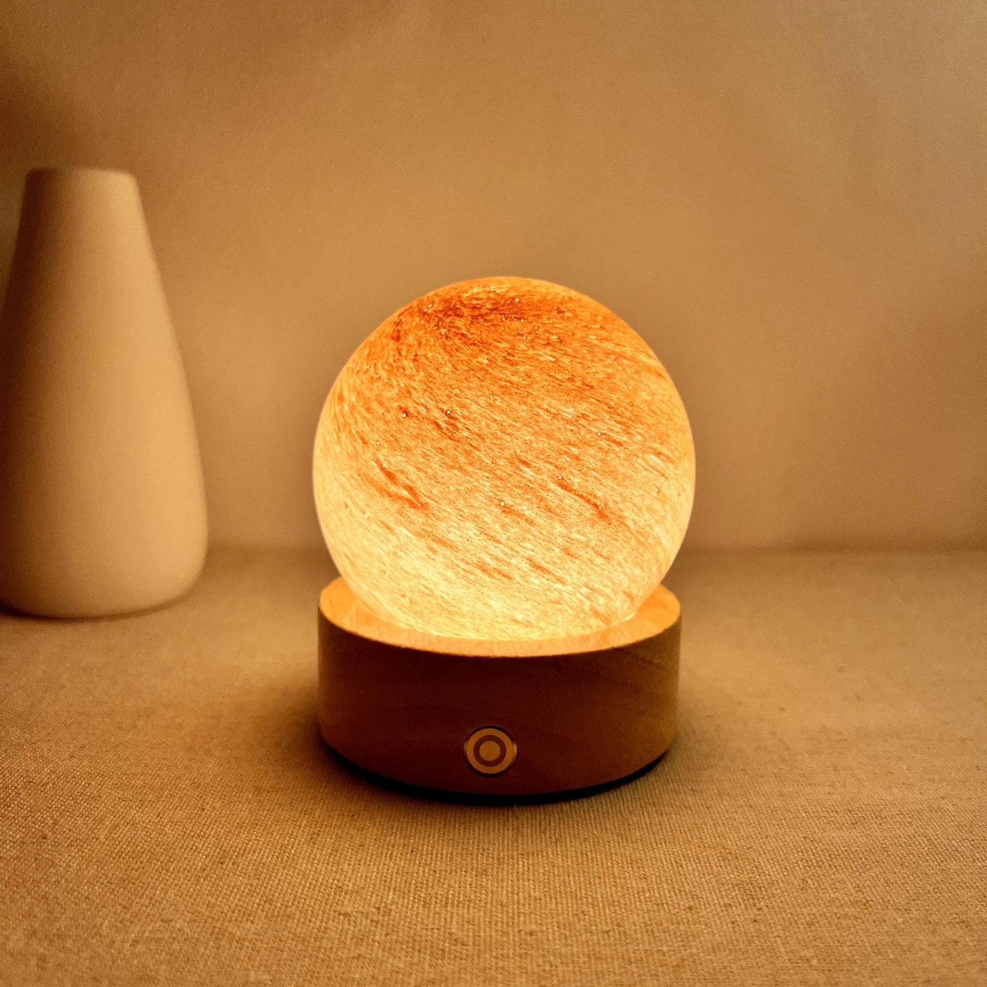 This exquisite night light brings the beauty of a fiery planet into your space. With its unique amber-colored sphere and natural wood base, the lamp creates a warm and romantic atmosphere.