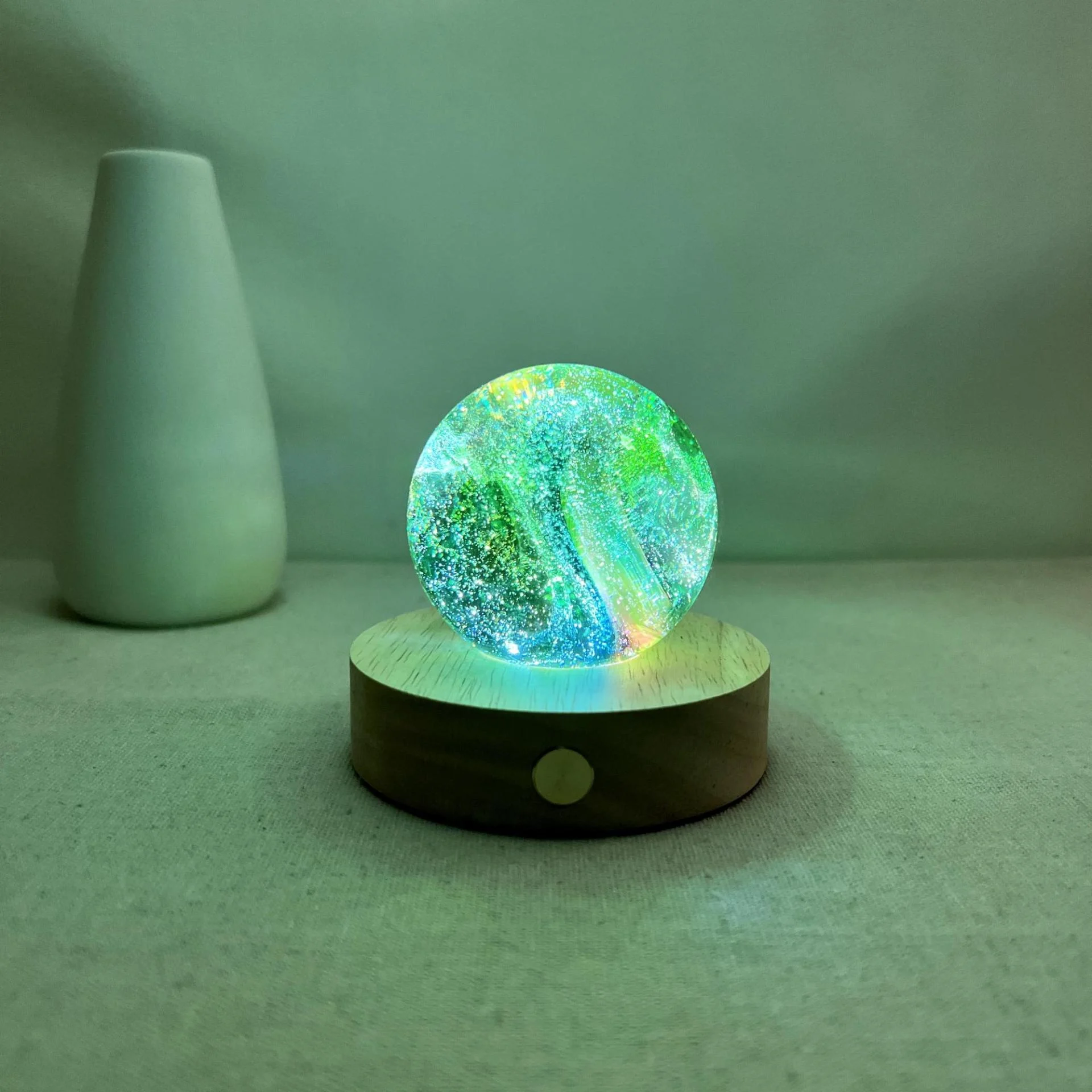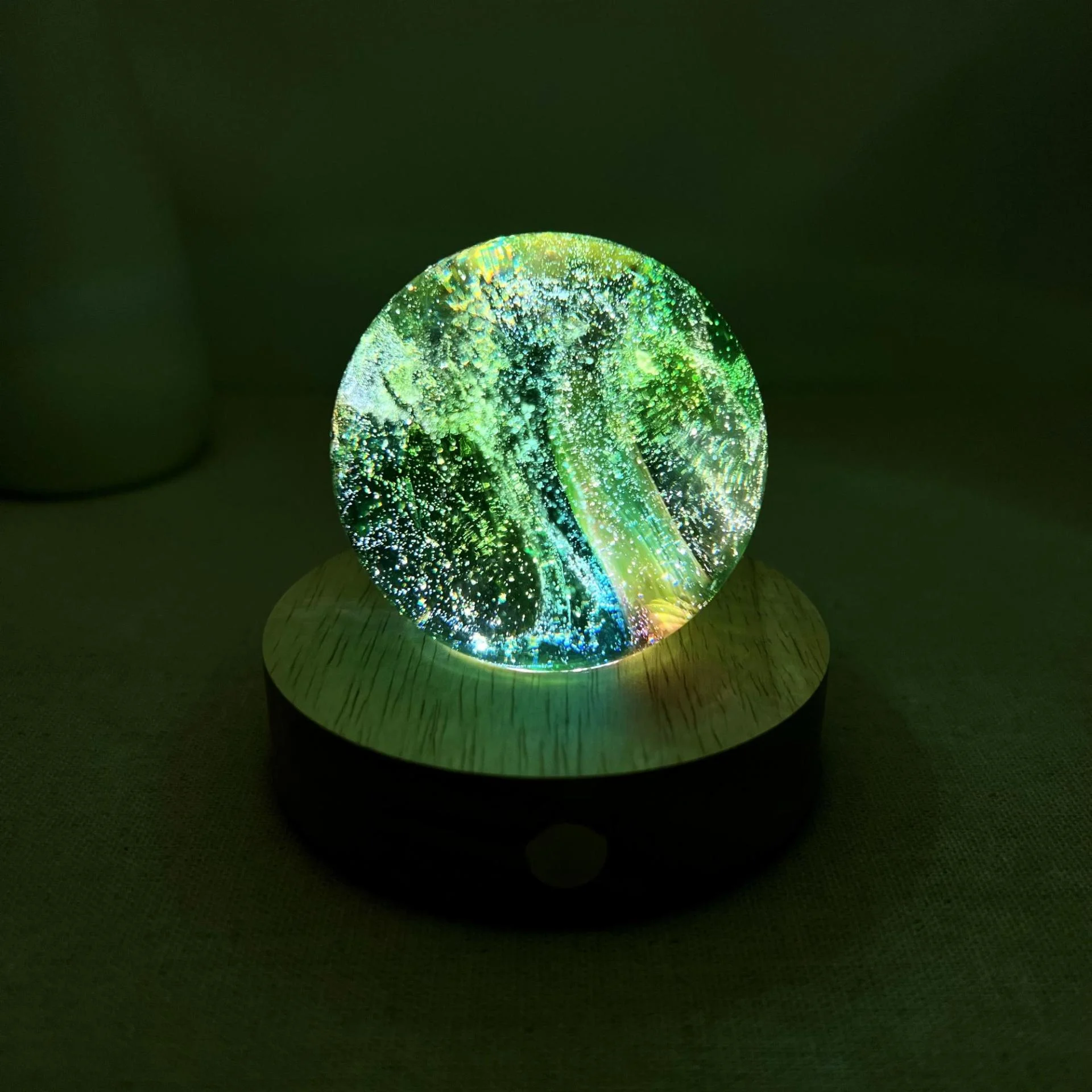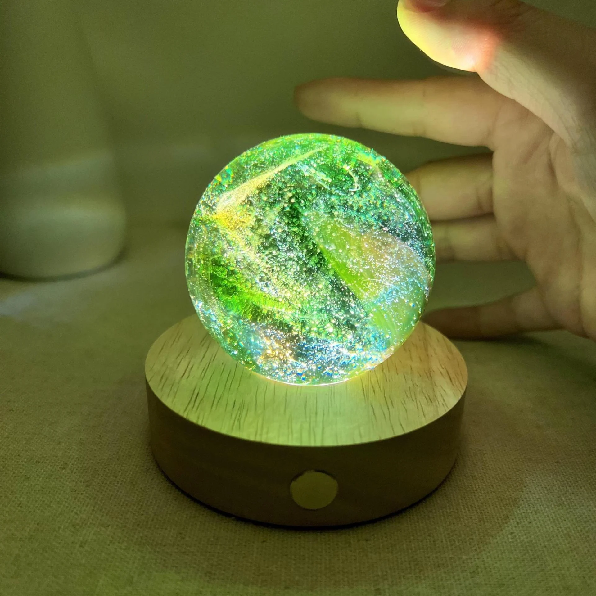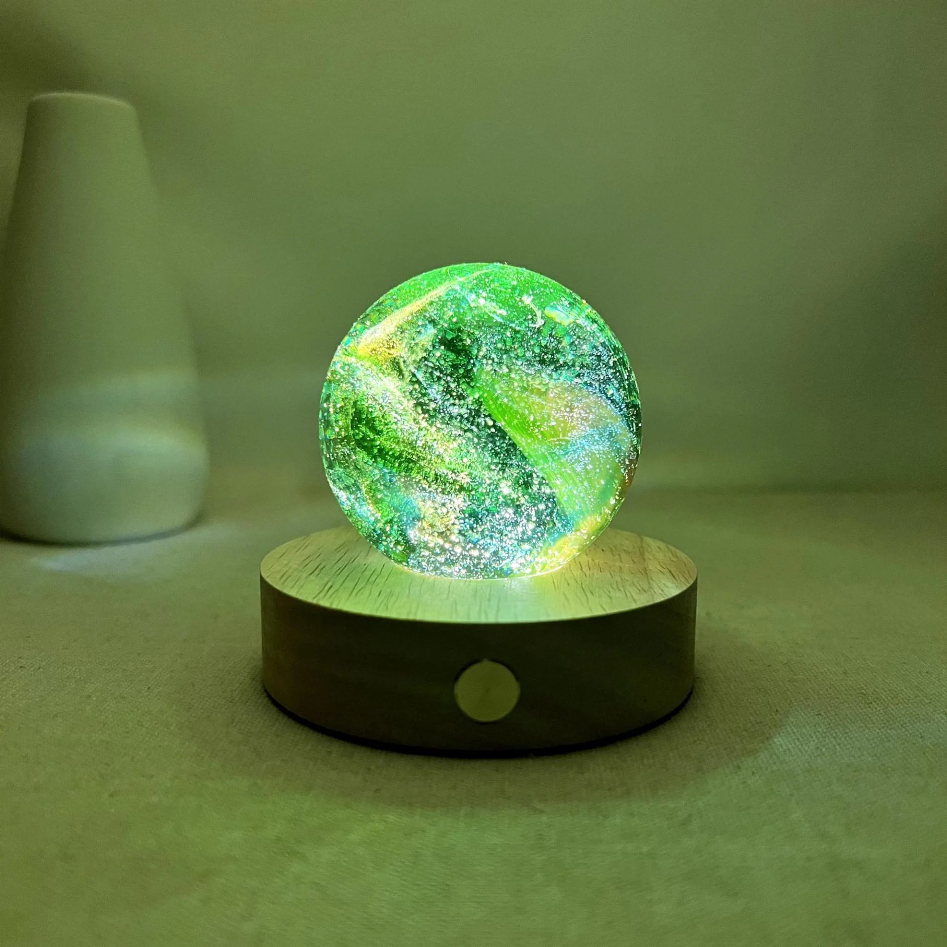 This crystal night light will take you on a journey through the stars right in your own living space. Inside the transparent crystal ball is a shimmering green galaxy, crafted to look incredibly vivid. When you turn on the light, the glow from the wooden base shines through, creating an enchanting miniature universe with vibrant green swirls and twinkling stars.