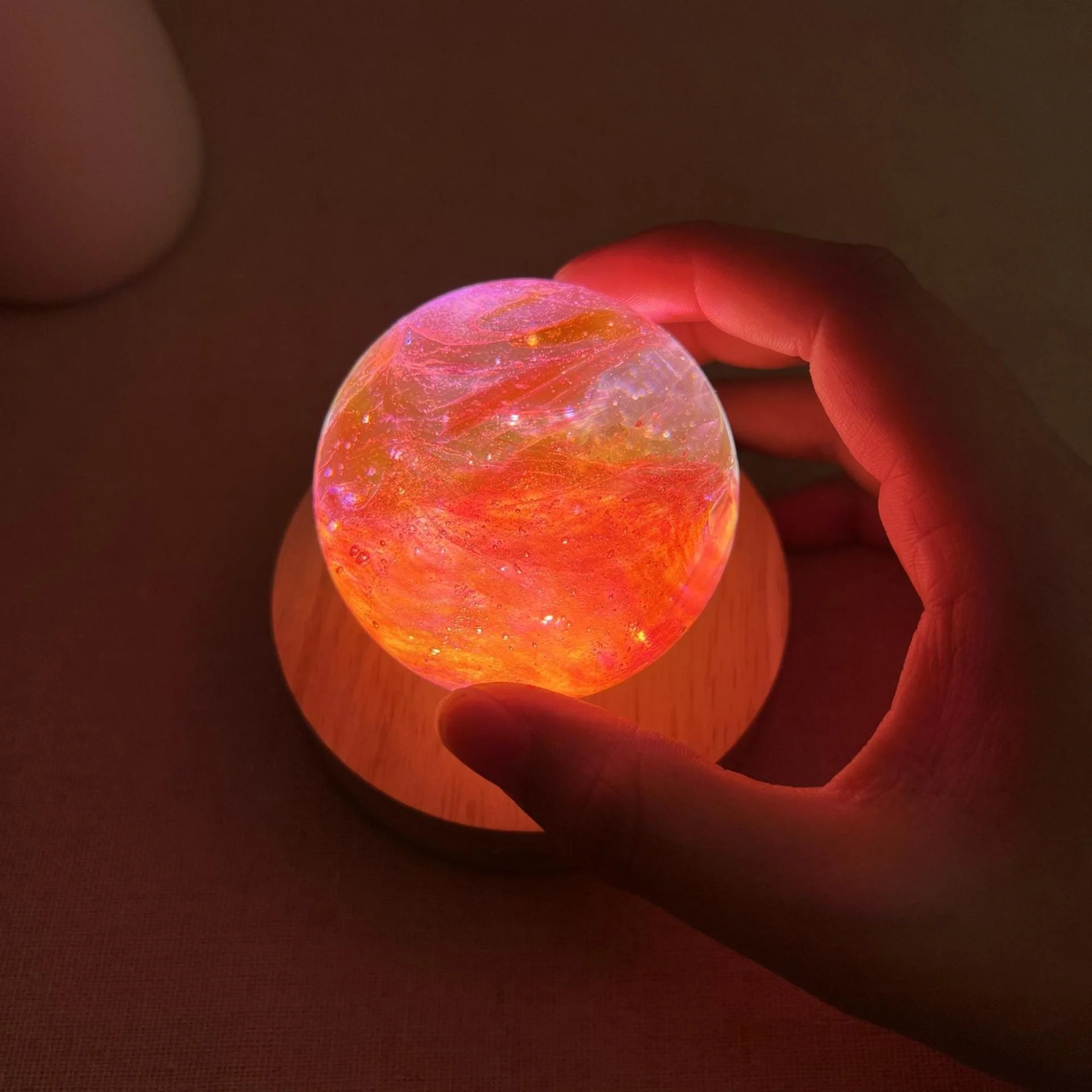 Design: A transparent crystal globe with a shimmering red and orange galaxy effect inside.