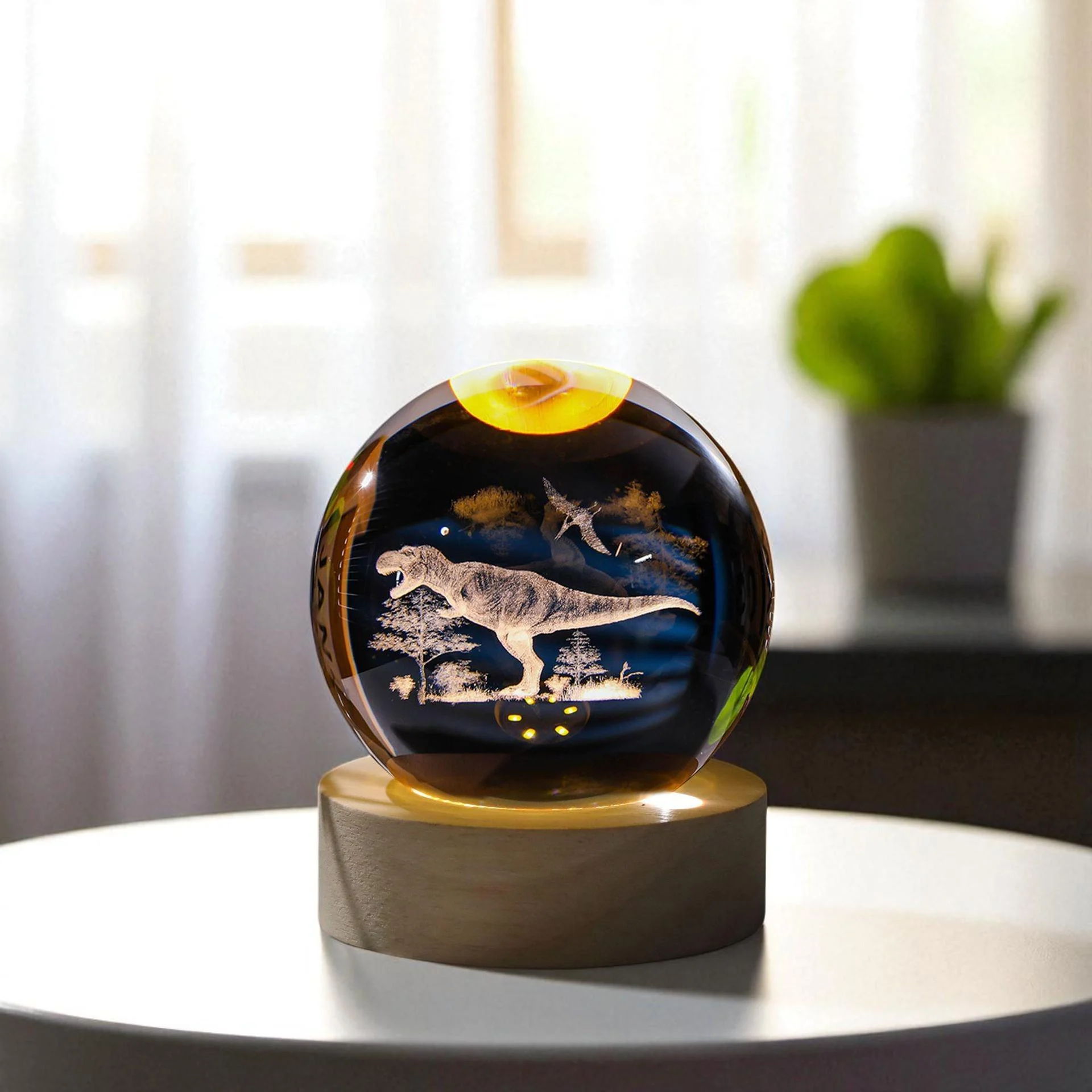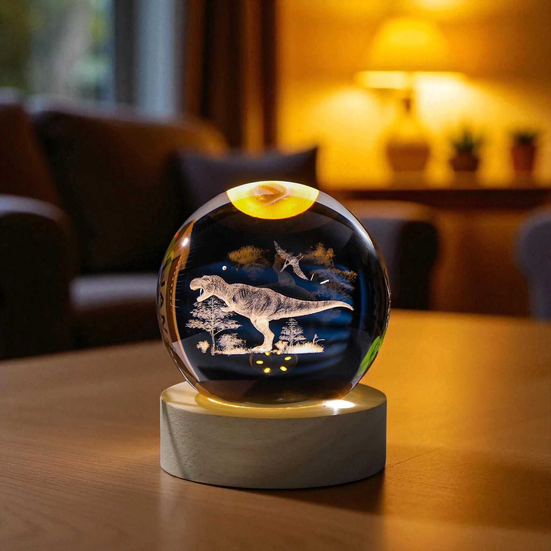 This special lamp uses advanced 3D laser engraving technology to create a vivid scene: a majestic dinosaur standing among trees, with a flying lizard soaring through the sky. All of this is enclosed within a finely crafted 6 cm clear glass/crystal globe.