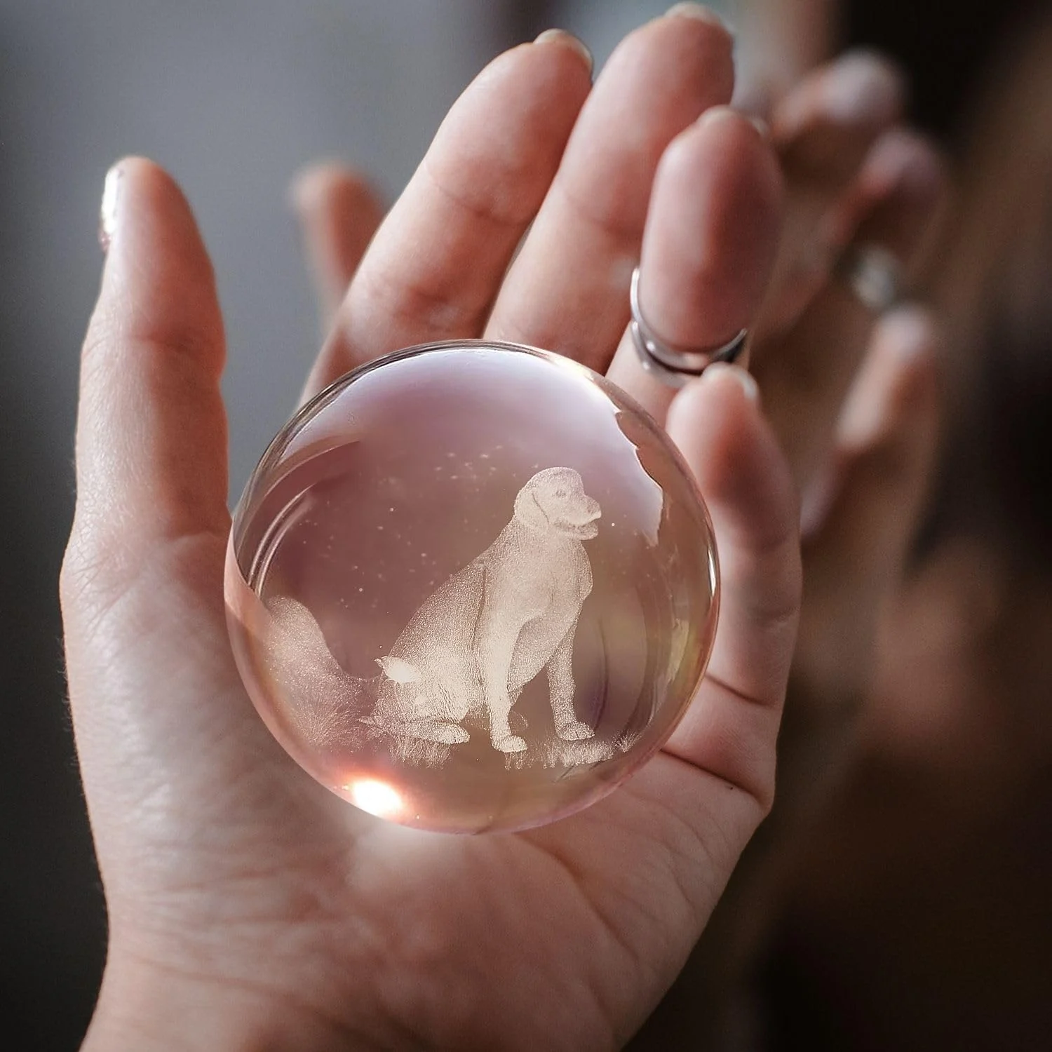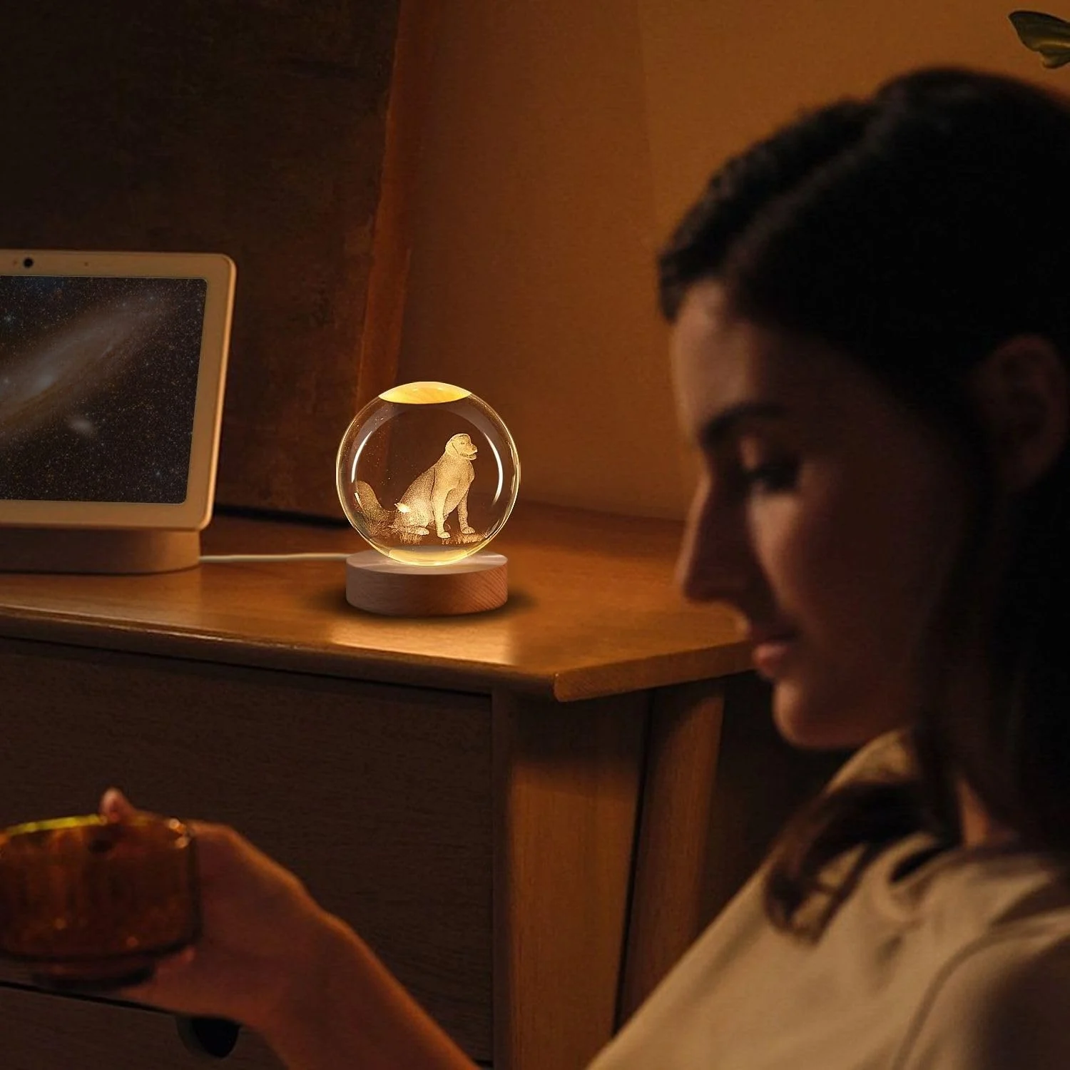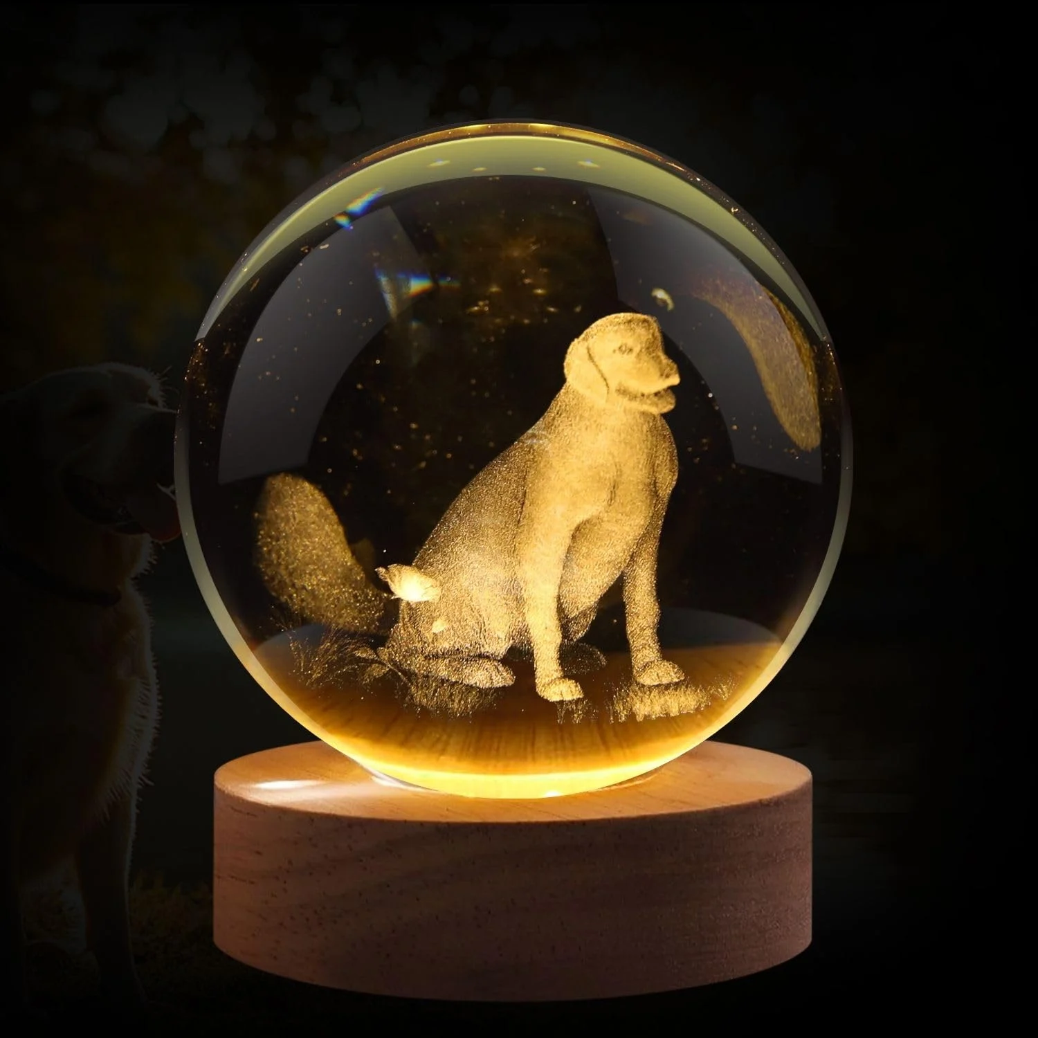 Crafted from premium K9 crystal and a durable oak wood base, this lamp is not just a source of light—it’s a work of art. Inside the transparent crystal ball, the image of a 3D dog (likely a Labrador or Golden Retriever) is laser-engraved in a lifelike manner. The dog is depicted in a seated position, with a gentle gaze and a slightly curled tail, radiating loyalty and friendliness.