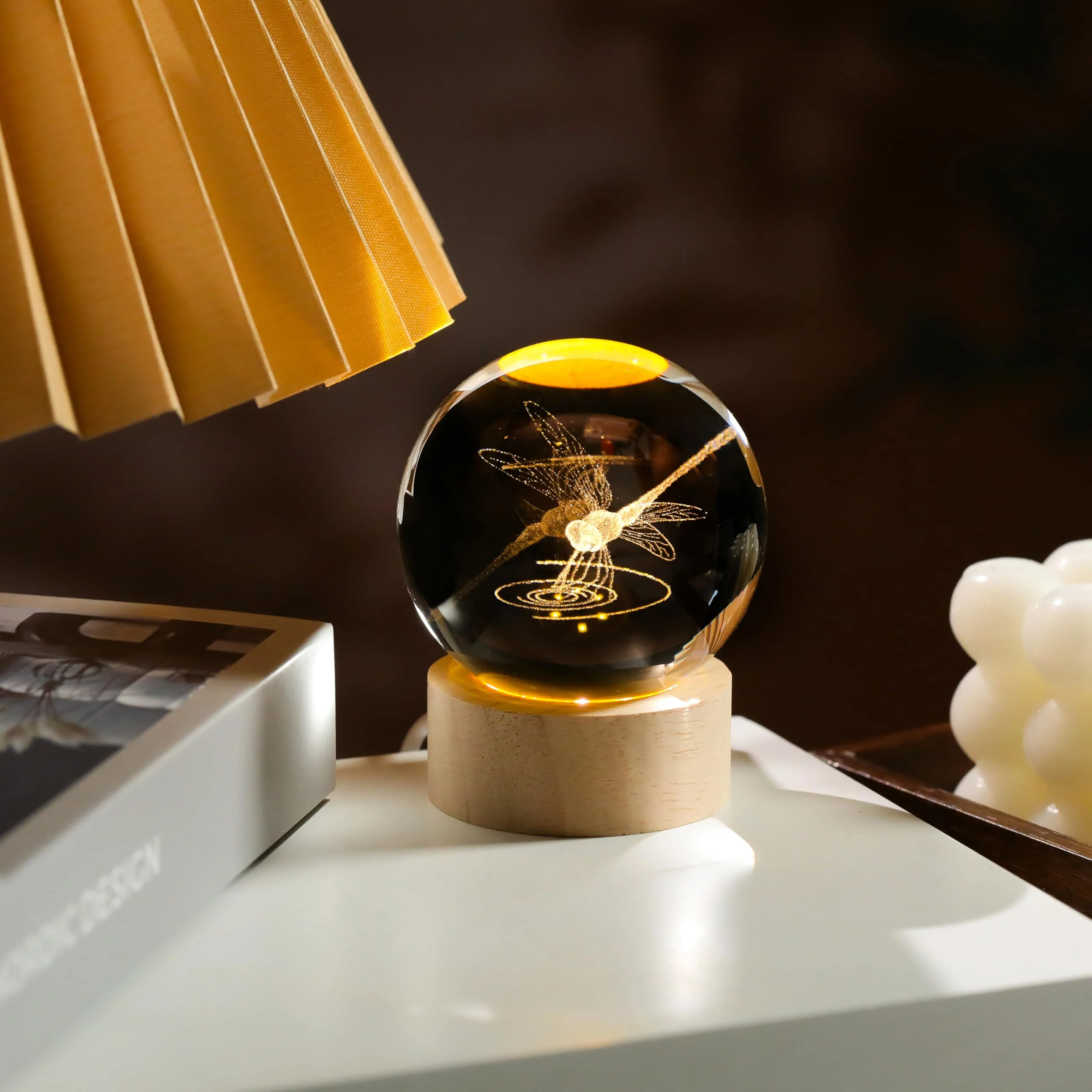A delicate 3D laser-engraved image of a dragonfly gently perching on rippling water inside the crystal ball, creating a tranquil and graceful moment.