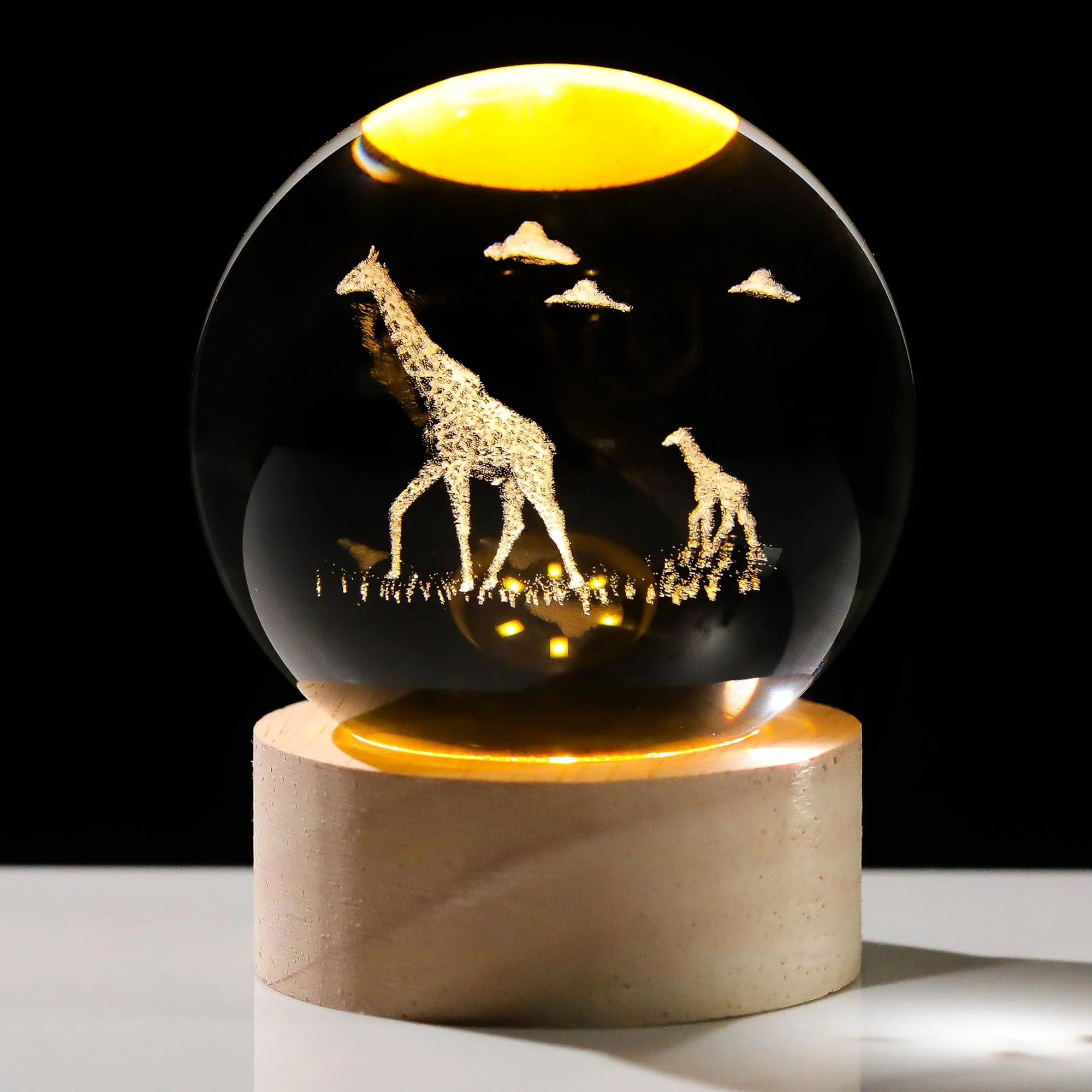 Inside the crystal ball is a 3D image of a giraffe family strolling across the savanna beneath the clouds, presenting a warm and wild nature scene. A timeless gift that blends natural enchantment with decorative function, perfect for anyone who appreciates beauty and imagination.