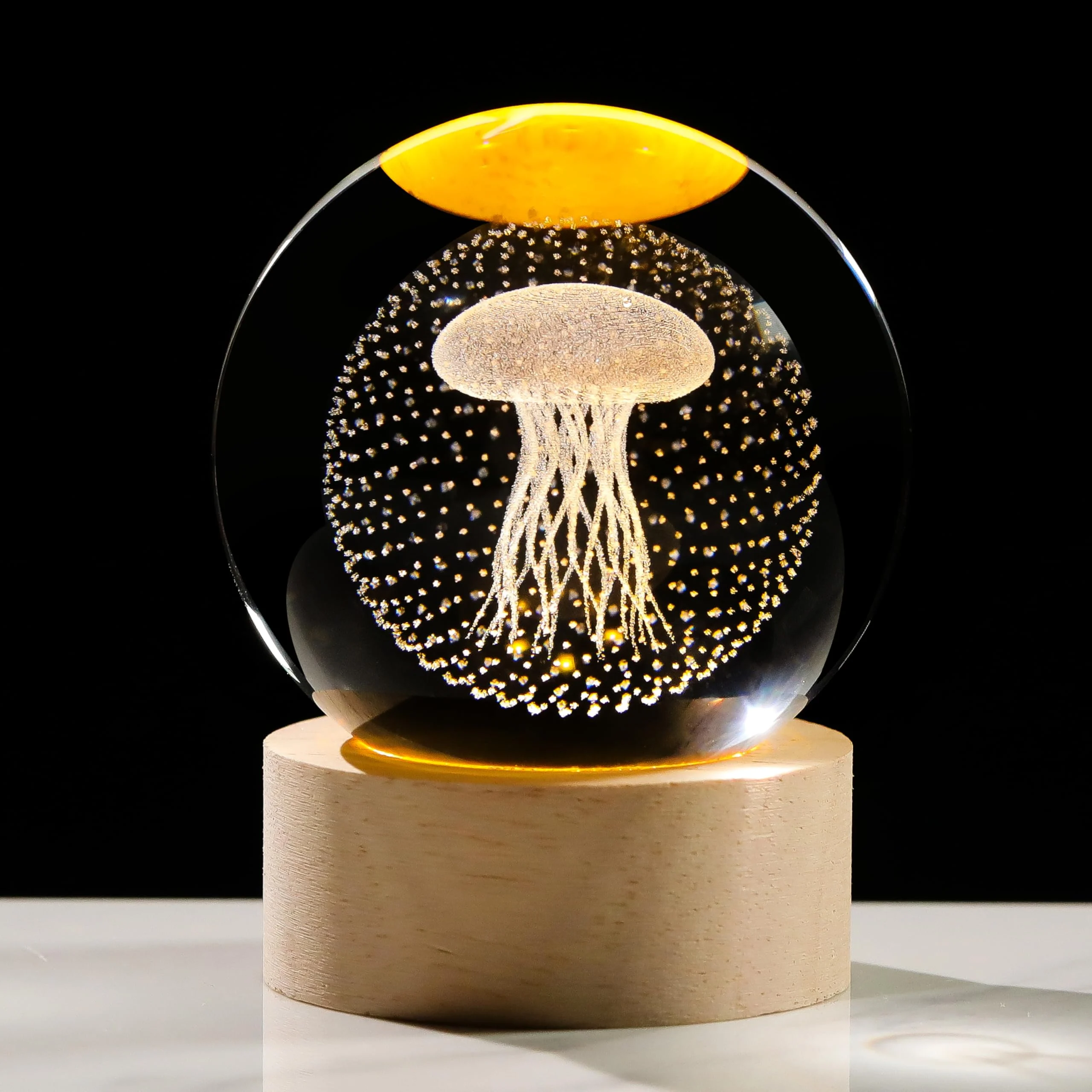 Inside the transparent crystal ball, the 3D image of a jellyfish with flowing tentacles and a sparkling, luminous body is finely laser-engraved, as if floating in a mystical ocean.