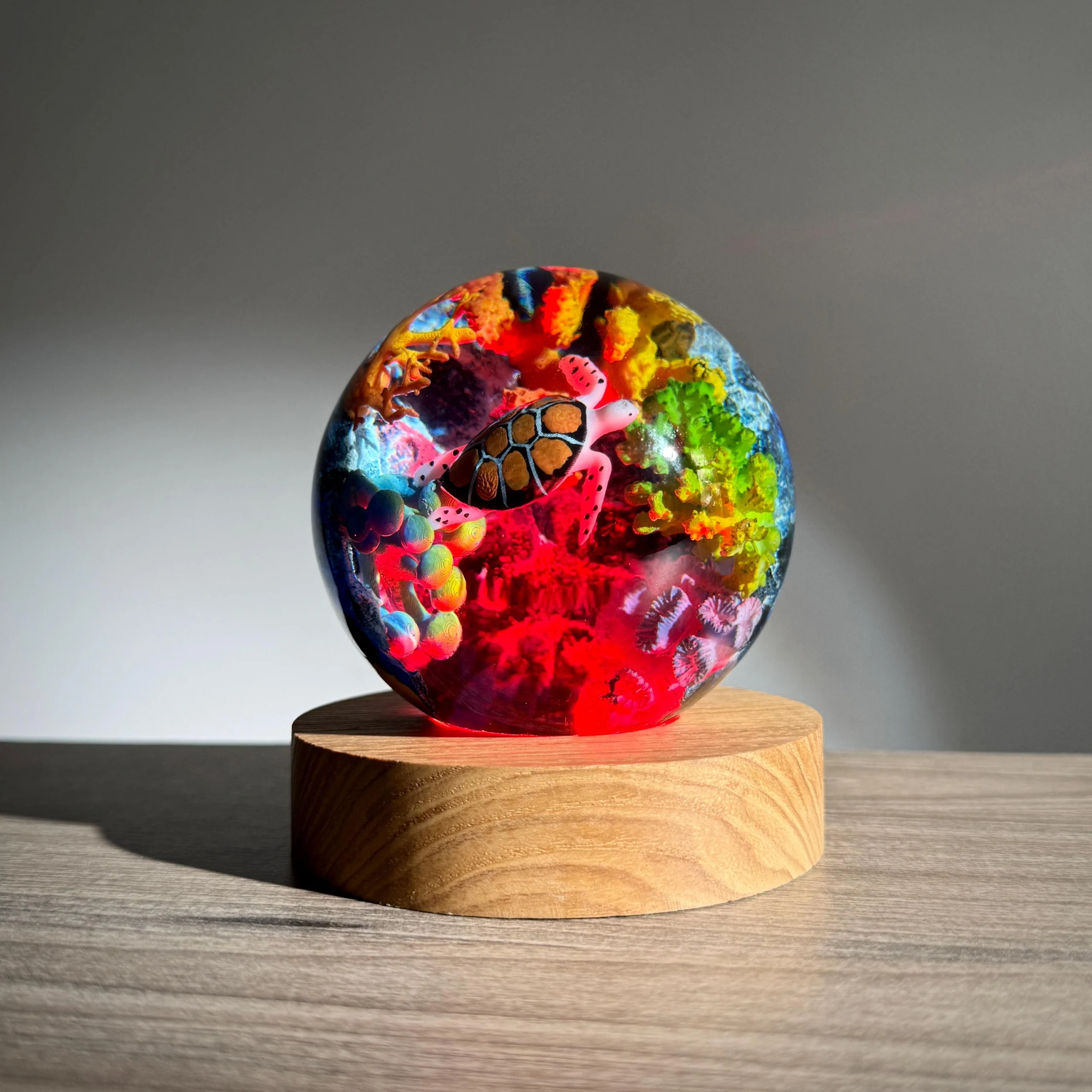 Lighting: Built-in LED base emits a soft, warm glow that enhances the underwater scene inside.