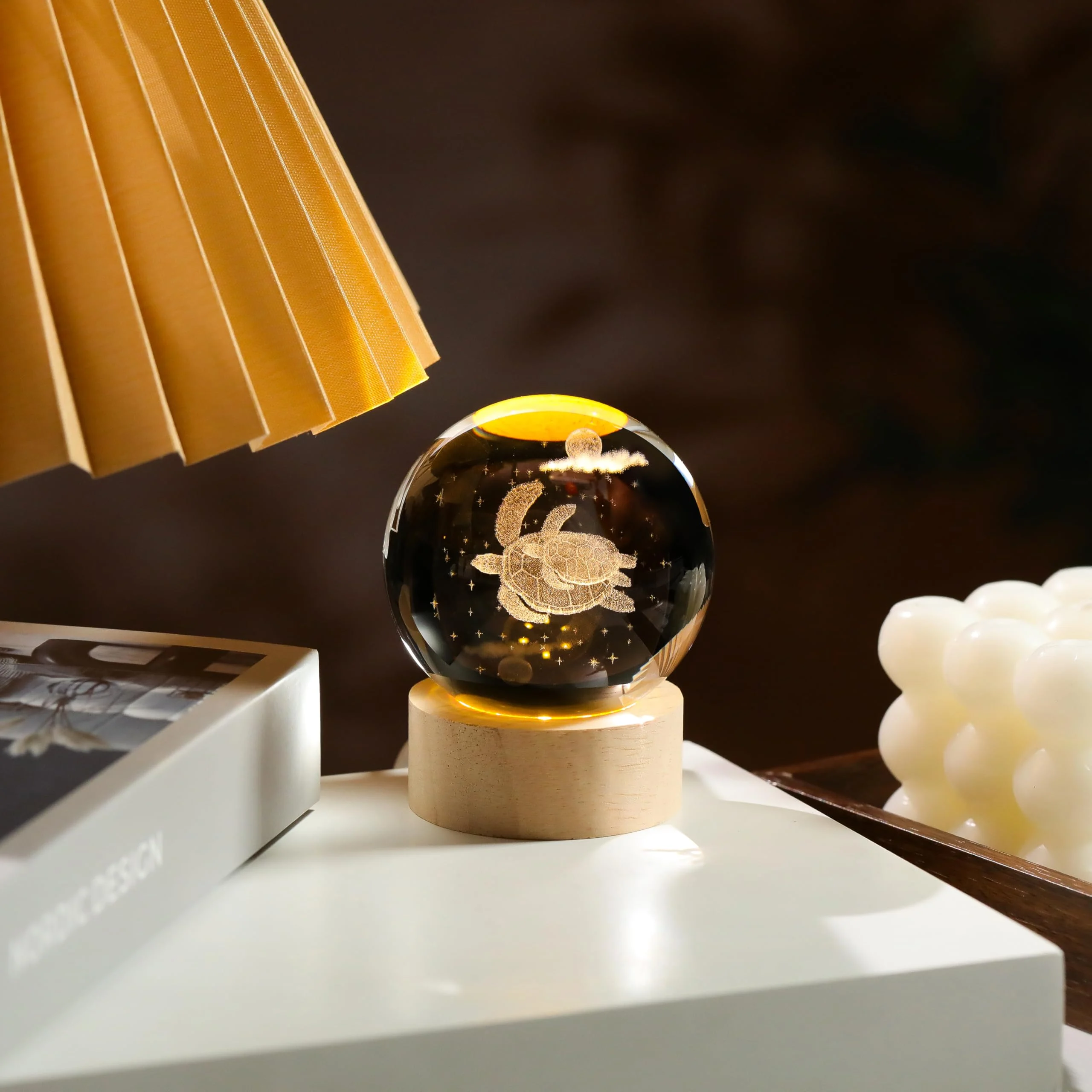 Inside the transparent crystal ball, a 3D laser-engraved image of a sea turtle shines brilliantly, as if swimming beneath the moon and a sparkling, star-studded night sky.