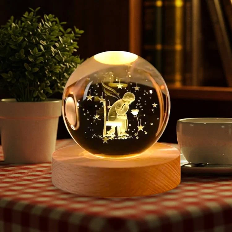 Advanced laser engraving technology creates the image of a boy sitting on a chair, leaning forward to gaze dreamily at a small flower, surrounded by twinkling stars. This design evokes a sense of peace, romance, and healing.