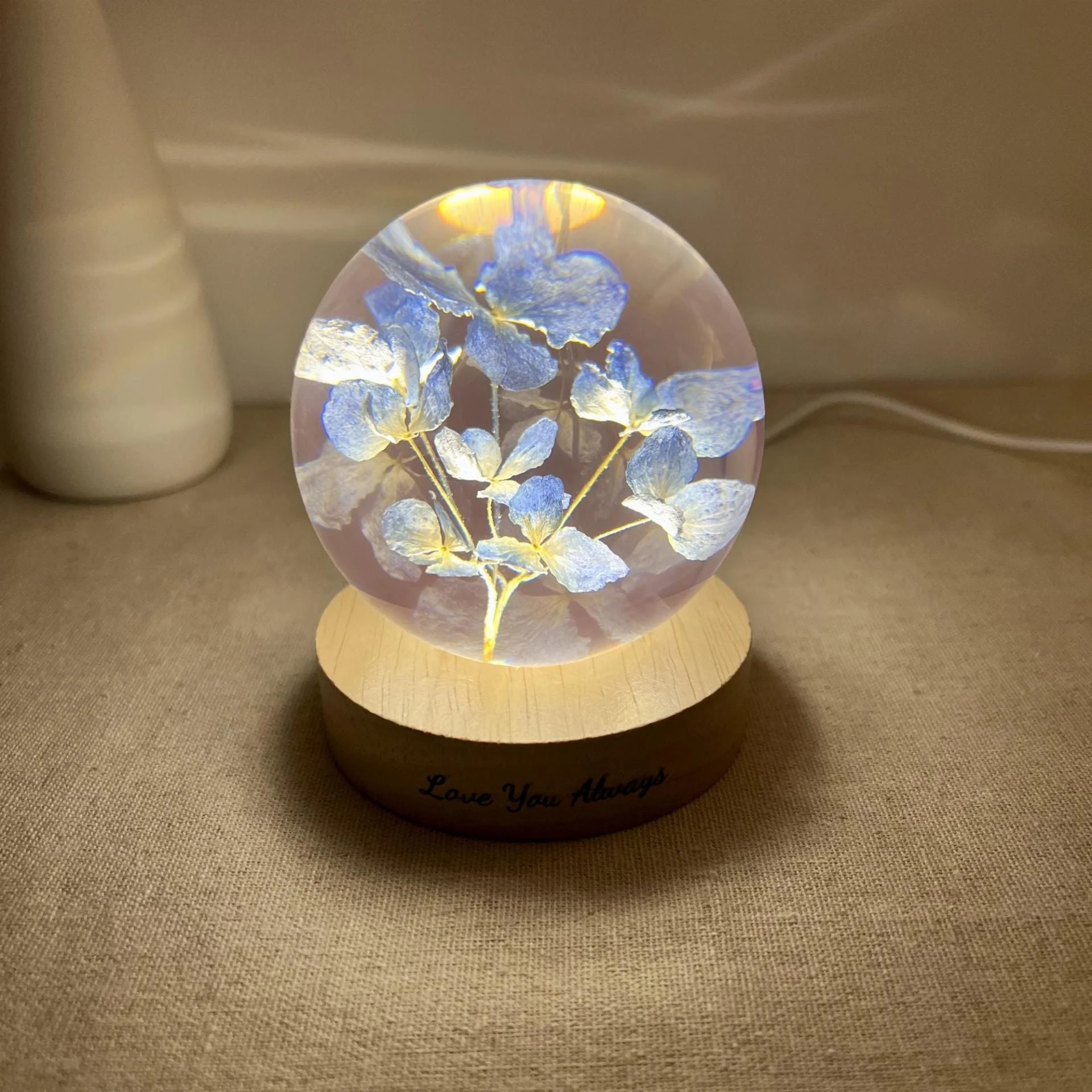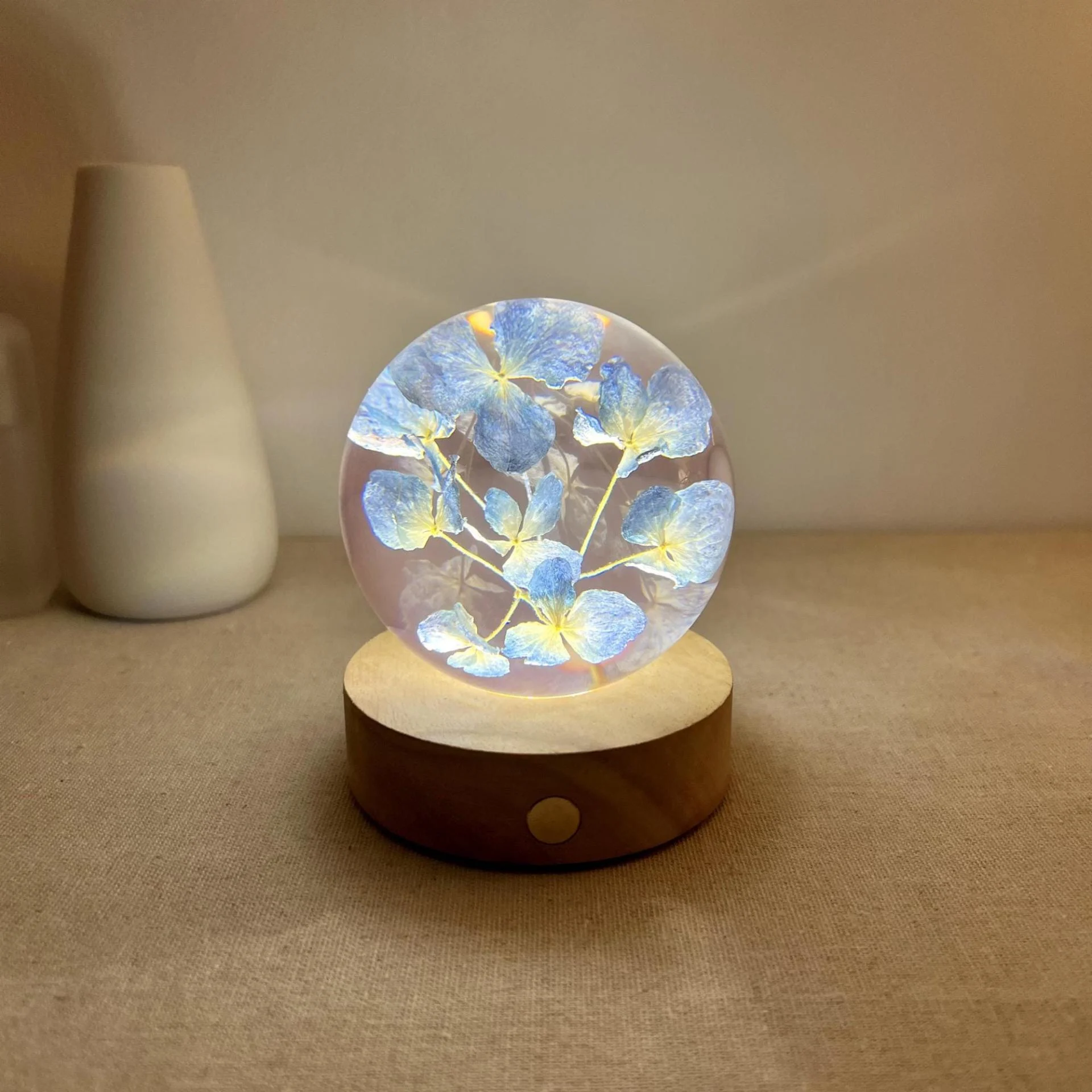 Natural Materials: This light is crafted from real blue hydrangea flowers, carefully preserved within a transparent crystal globe.