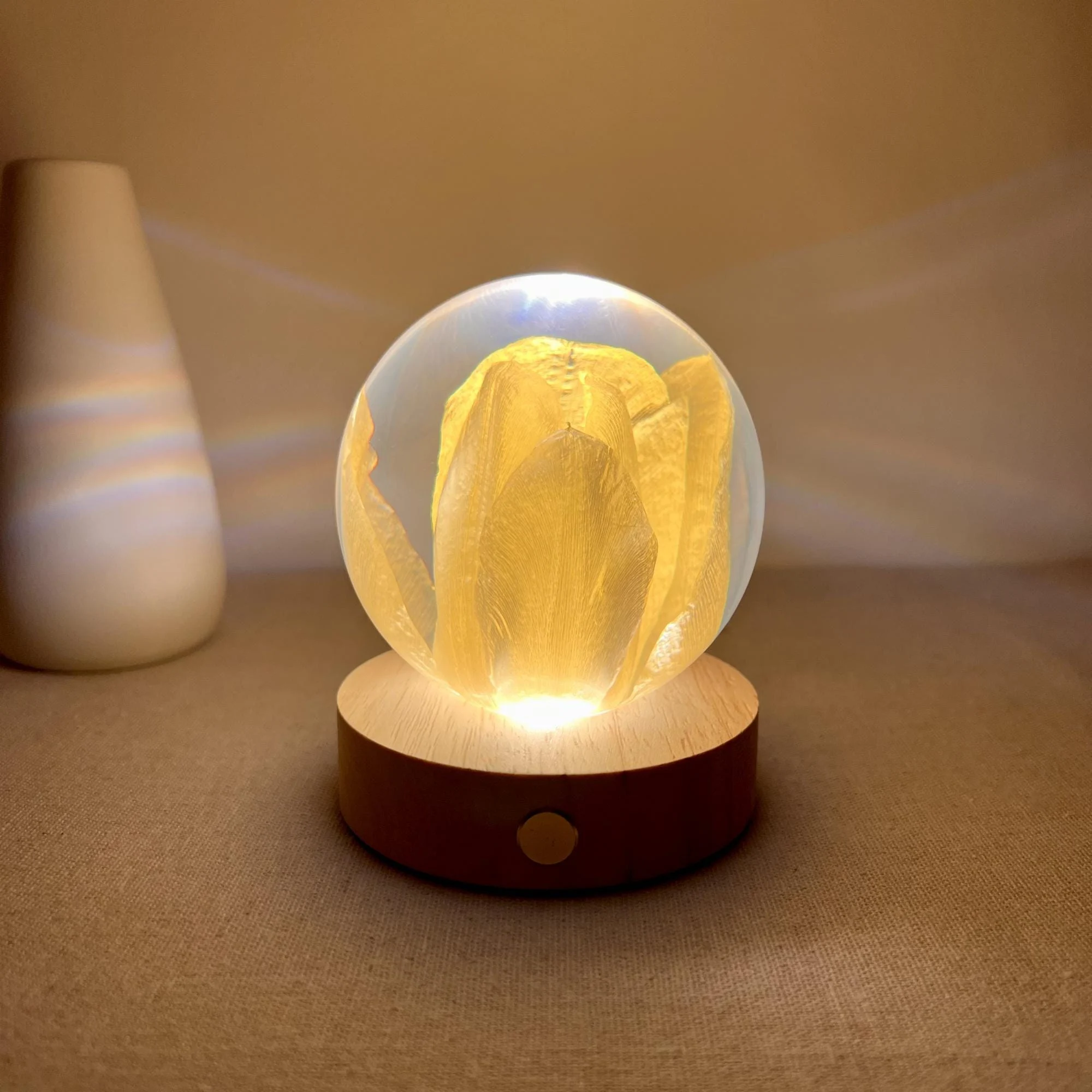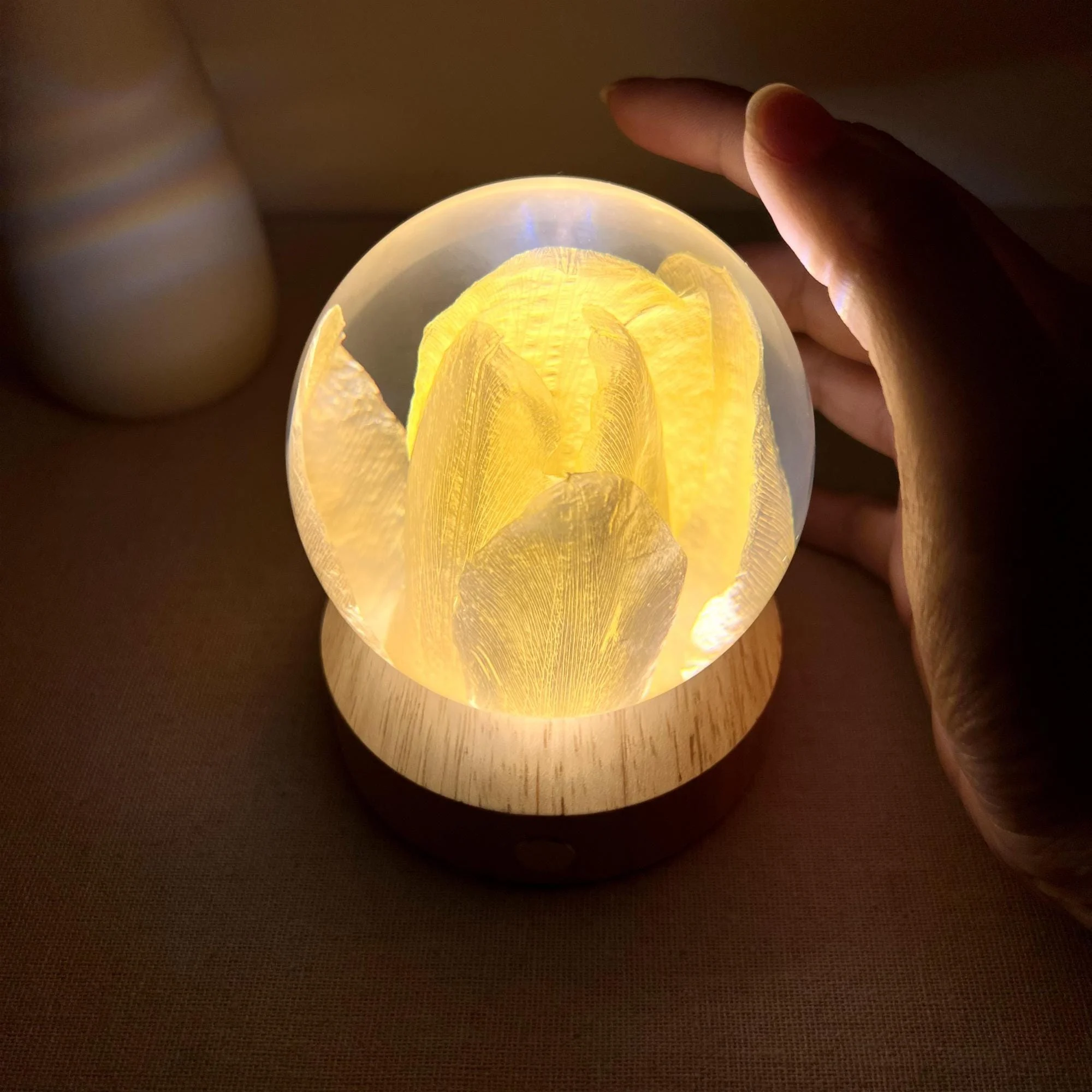 Design and Details: Inside a transparent crystal ball, measuring 3.1 inches, is a carefully preserved real golden tulip, creating a vivid and lifelike work of art. The warm light from the wooden base shines through the ball, reflecting on the ceiling to form a stunning effect of six glowing circles.