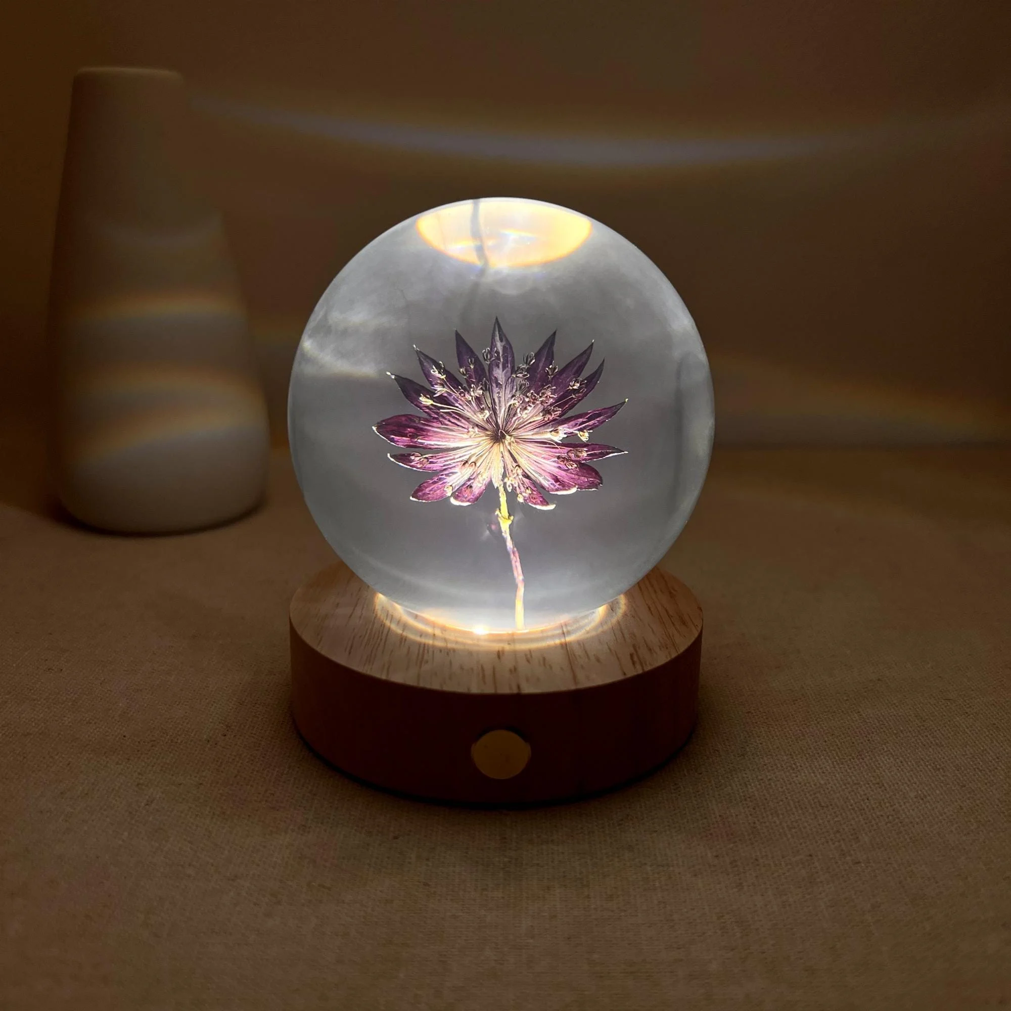 Artistic Design: A genuine, dried star celery flower is preserved inside a transparent crystal ball, creating a lifelike work of art. Light from six small bulbs in the base shines through the sphere, reflecting on the ceiling to create a beautiful effect of six luminous circles.